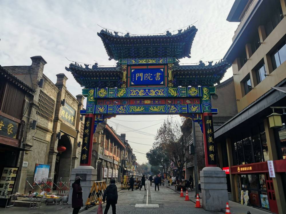书院门,因在关中书院门前而得名,指的是从碑林到关中书院门口的一条步行街,位于南门内东侧,东至安居巷接三学街,街道两旁是清一色仿古建筑,鳞次栉比地集中了名人字画、印章印谱、文房四宝等一百多家店铺。这里承载了西安厚重绵长的民俗文化,笔墨纸砚、手办文玩、小吃饮品,是西安一条著名的古文化商业街。书院门步行街是古都西安的文化古玩荟萃之地,是热爱中国古代文化的淘宝达人们的购物胜地。