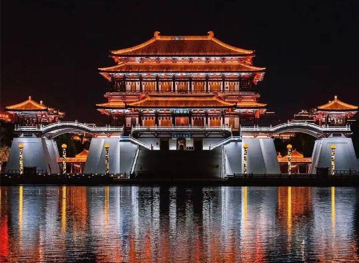 夜景色彩璀璨,灯火辉煌中的唐文化长廊、芳林苑、紫云楼等地,处处灿烂夺目。园区有祈天鼓舞、“教坊乐舞”宫廷演出、“艳影霓裳”服饰表演等。在凤鸣九天剧院上演的大型舞剧《梦回大唐》,是一台集盛唐风情、歌舞精粹于一体的乐舞表演。